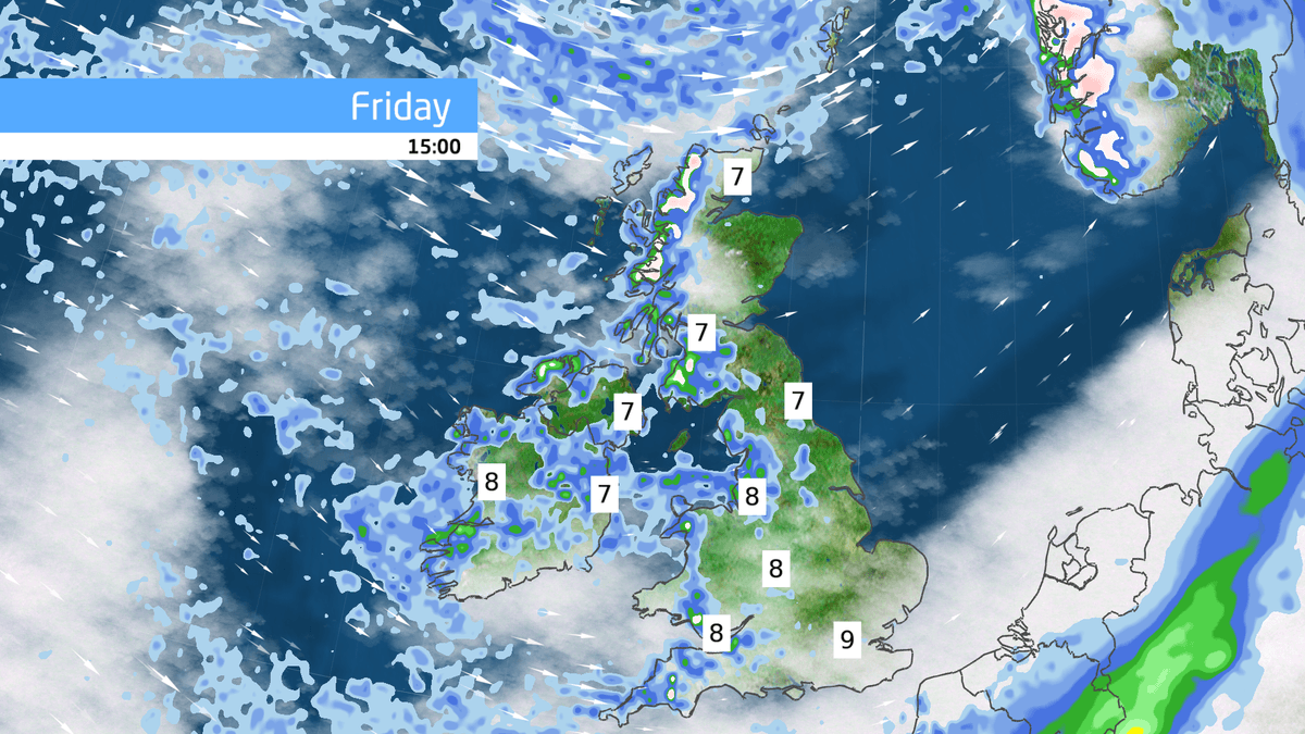 💦 Cloudier elsewhere, with rain pushing southeast.
